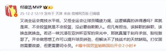 12月1日晚上,中国男篮客场以76-90不敌韩国男篮,惨遭世预赛的2连败,输得很是叫人无语。这不是中国男篮该有的表现,毕竟在亚洲杯的舞台上,中国男篮是亚军,还击败了韩国队。如今,连遭韩国队击败,中国男篮输得叫人无法接受。12月2日,媒体人付政浩就怒了,公开不点名怒怼郭士强,直言该辞职就辞职,并且还给中国男篮指明了方向。